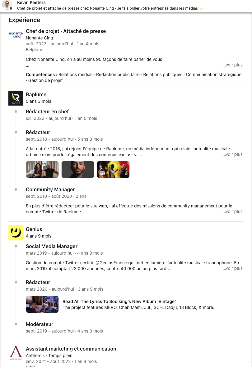 Voici quelques exemples directement tirés des profils des membres de l’équipe chez Nonante Cinq, ou mis en application par nos soins sur ceux de nos clients·es, comme c’est le cas de Marvin Ndiaye, CEO de Fresheo, et Melvin Lecoq, à la tête de Accès Habitat. Le but ? Mettre la pleine lumière sur leurs activités !