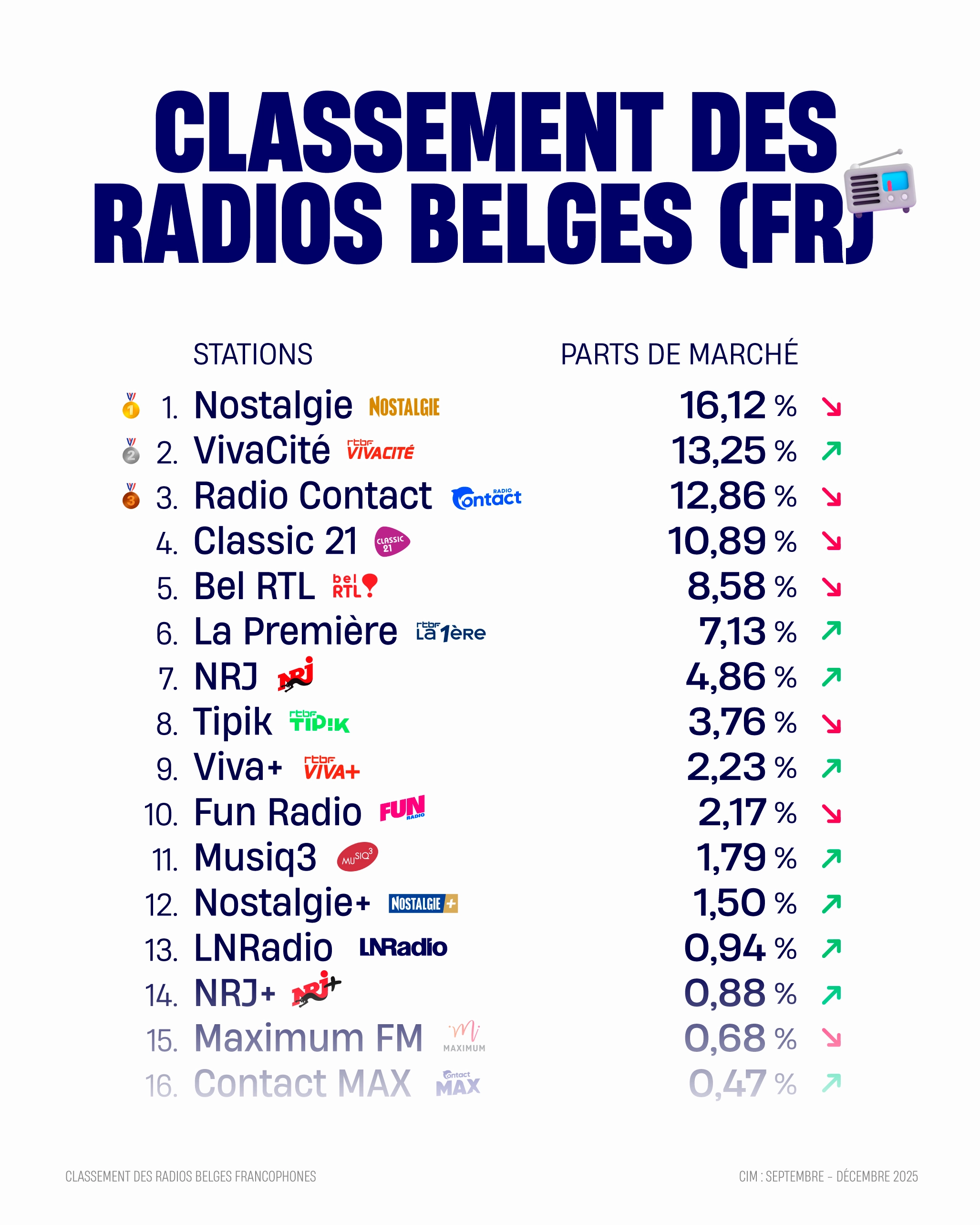 • Radio Contact (RTL) complète le podium avec 12,86 %.