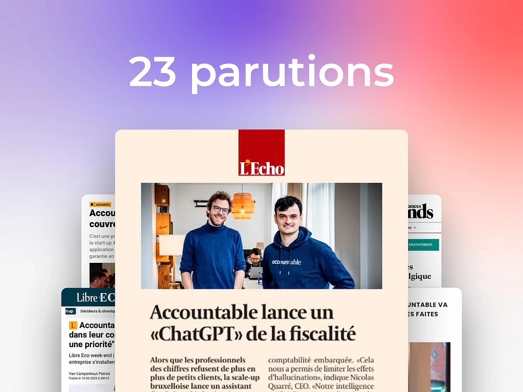 Au cours de notre collaboration, nous avons visibilité plusieurs de leurs actualités dans les médias : une campagne de notoriété généraliste en 2023 afin d'implanter la marque ; à l'occasion du lancement de leur site Fraispro.be dédié aux frais professionnels ; à propos de la garantie offerte par la startup quant aux déclarations fiscales faites via l'application et finalement, en 2024, en ce qui concerne le lancement de leur assistant IA.