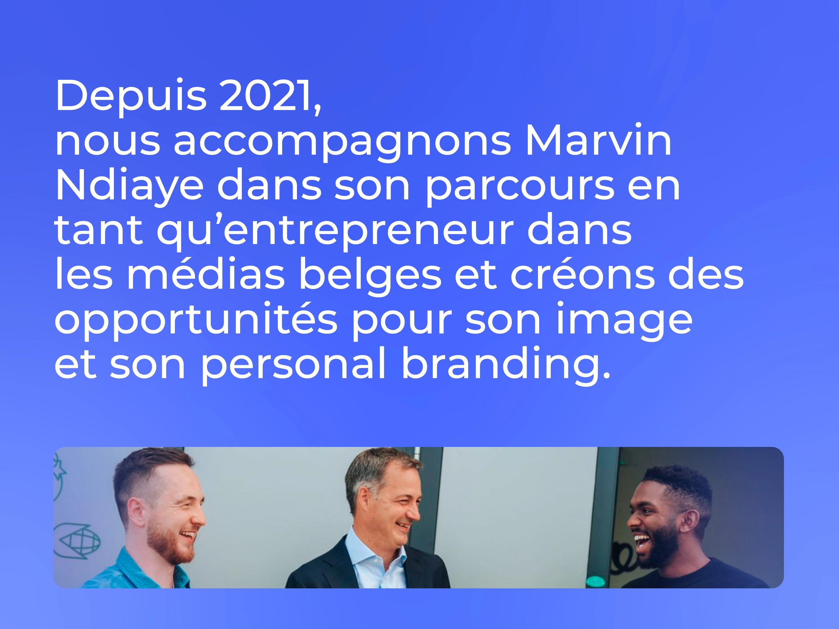 Depuis 2021, nous l'accompagnons dans son parcours entrepreneurial afin de le visibiliser dans les médias et créer des opportunités pour développer son personal branding. Après être passé dans la quasi totalité des médias belges, dont plusieurs JT nationaux, avoir participé à une campagne Belfius pour les entrepreneurs et reçu plusieurs prix prestigieux (dont Les Étincelles 2023), Marvin a fait la rencontre du Premier ministre Alexander De Croo 🇧🇪