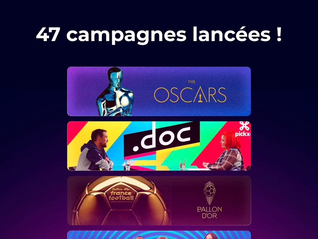 Quelques exemples de campagnes que nous avons menées : Les Oscars, le Festival de Cannes, Fresh Festival, Offline, le Ballon d'Or, .doc, Golden Globes, Champ Contre-Champ. En tout, 53 campagnes, 82 médias différents et près de 700 résultats !