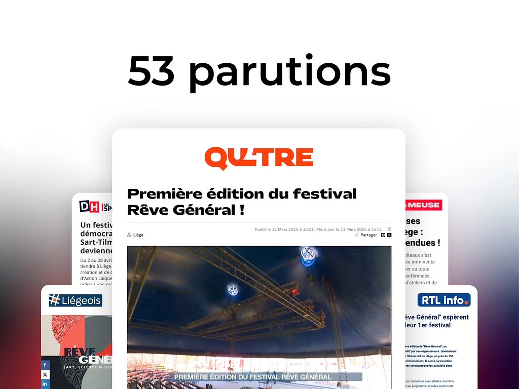 Du 2 au 28 avril 2024 s’est déroulée la première édition du festival « Rêve général ». Un événement haut en couleurs porté par la structure Arsenic2, en collaboration avec le Centre d’Action Laïque et l’Université de Liège. Unique en son genre dans le paysage culturel belge, le festival a pour particularité d’allier art, sciences et démocratie, autour de 150 activités (expositions, conférences, master class, spectacles, concerts, etc).