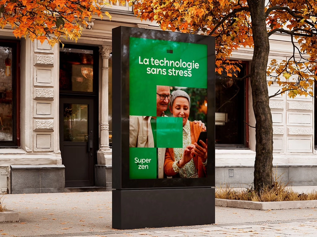L'ensemble permet de créer un univers technologique accueillant et sans jugement qui permettra à la cible de se sentir accompagnée avec bienveillance dans leur vie technologique au quotidien.