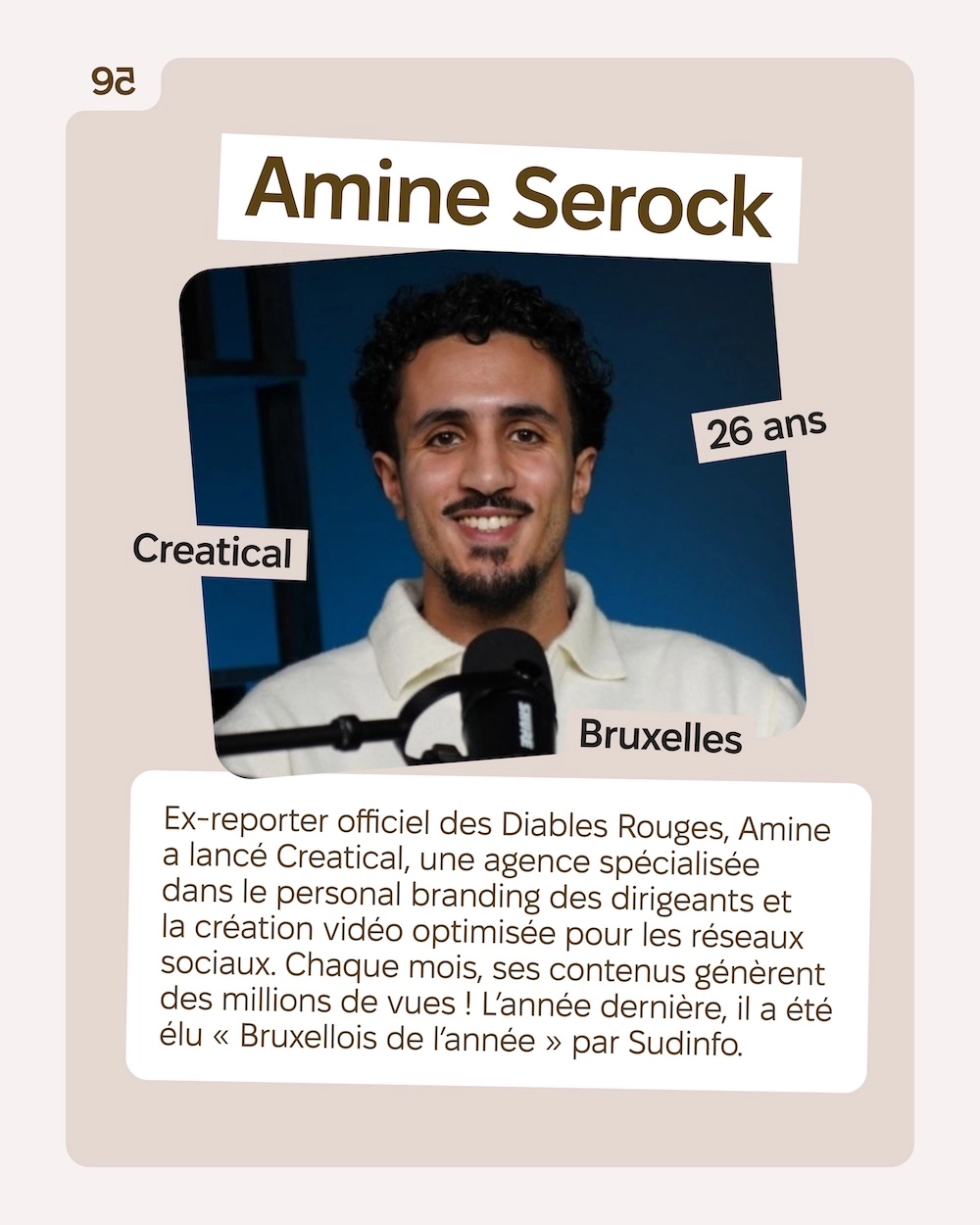 À 26 ans, l'ex-reporter officiel des Diables Rouges a transformé sa passion pour l'image en un moteur de croissance avec Creatical. Spécialiste du personal branding, ses contenus génèrent des millions de vues chaque mois. Il a d'ailleurs été sacré "Bruxellois de l'année" par Sudinfo.