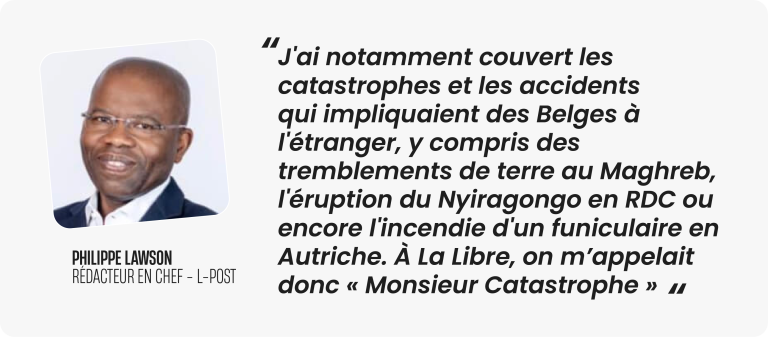 En arrivant ici, j’ai dû tout reprendre à zéro. J’ai commencé Sciences Po en cours du jour et journalisme en cours du soir, avec l’idée de rentrer au Togo. De stage en stage, d’abord à la Gazette de Liège, je me suis fait une place, jusqu’à devenir un journaliste phare à La Libre. J’ai notamment couvert les catastrophes et les accidents qui impliquaient des Belges à l’étranger, y compris des tremblements de terre au Maghreb, l’éruption du Nyiragongo en RDC ou encore l’incendie d’un funiculaire en Autriche. À La Libre, on m’appelait donc « Monsieur Catastrophe ». Après cinq ans, j’avais vraiment besoin de déconnecter et j’ai donc demandé pour aller au service économique de La Libre.