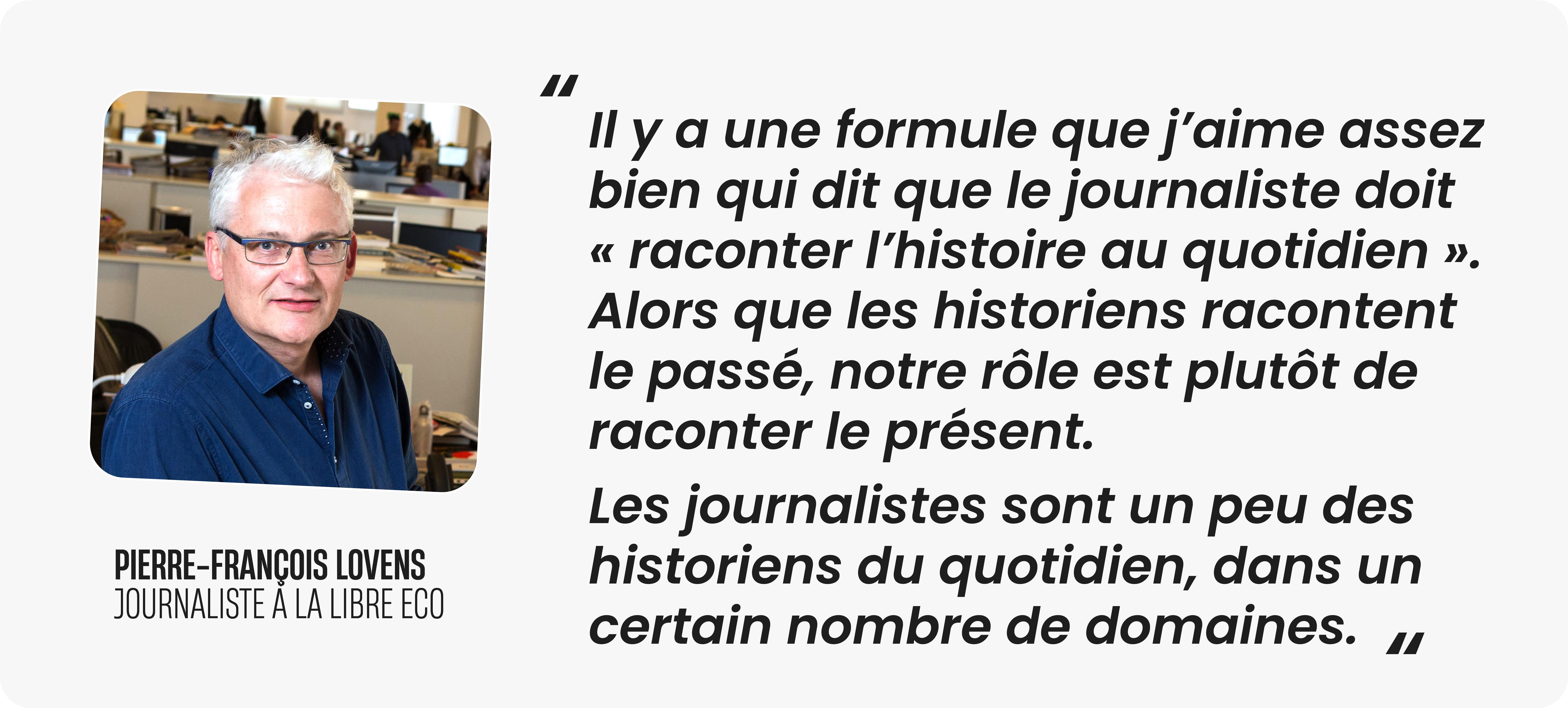 Il y a une formule que j’aime assez bien qui dit que le journaliste doit « raconter l’histoire au quotidien ». Alors que les historiens racontent le passé, notre rôle est plutôt de raconter le présent. Les journalistes sont un peu des historiens du quotidien, dans un certain nombre de domaines.