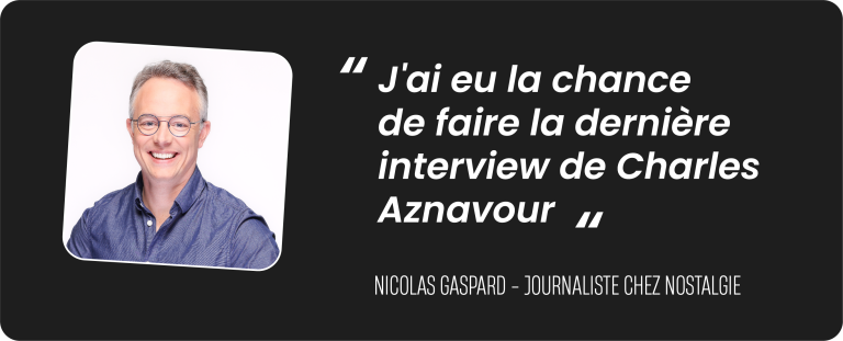 Enfin, pour la touche plus légère, j’ai eu la chance de faire la dernière interview de Charles Aznavour. Je suis allé jusqu’à Paris, j’ai passé une heure avec lui, et deux jours après être rentré à Bruxelles, j’ai appris son décès. Enfin, pas sûr que ce soit si léger… (rires)