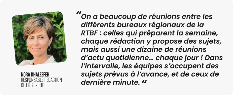 Je pilote la rédaction de Liège, sur toutes les plateformes (télé, radio, digital). Chaque jour, on a une grosse réunion pour faire le point et le tour des idées. On est sollicités par beaucoup de monde : les attachés de presse, les entreprises, les communes, les ASBL, nos informateurs, etc. Il faut faire le tri là-dedans et déterminer sur quelle plateforme ce sera le plus pertinent. J’ai un peu le rôle d’arbitre au niveau éditorial s’il faut faire des choix.