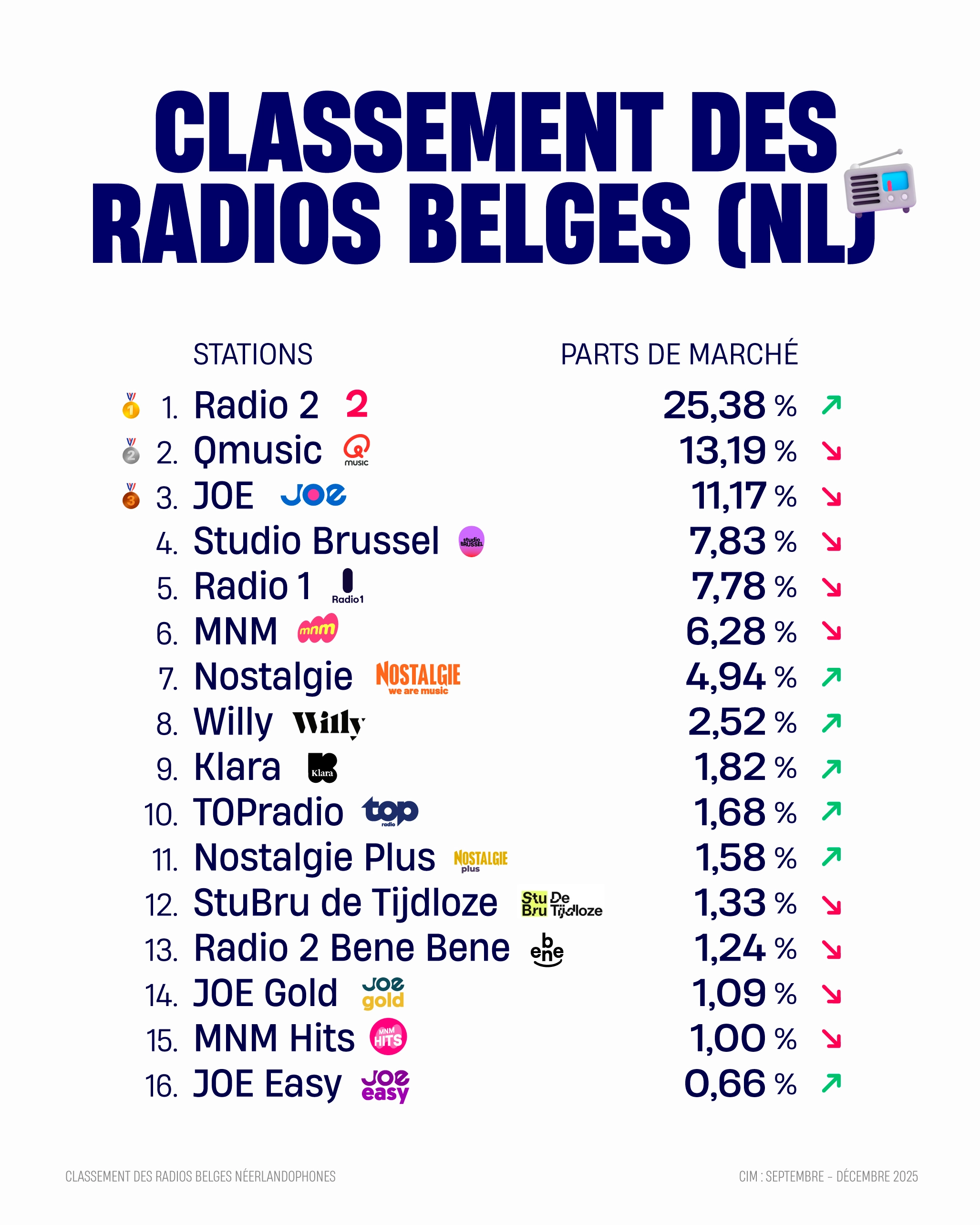 • Radio 2 (VRT) domine largement le secteur avec 25,38 % des parts de marché.