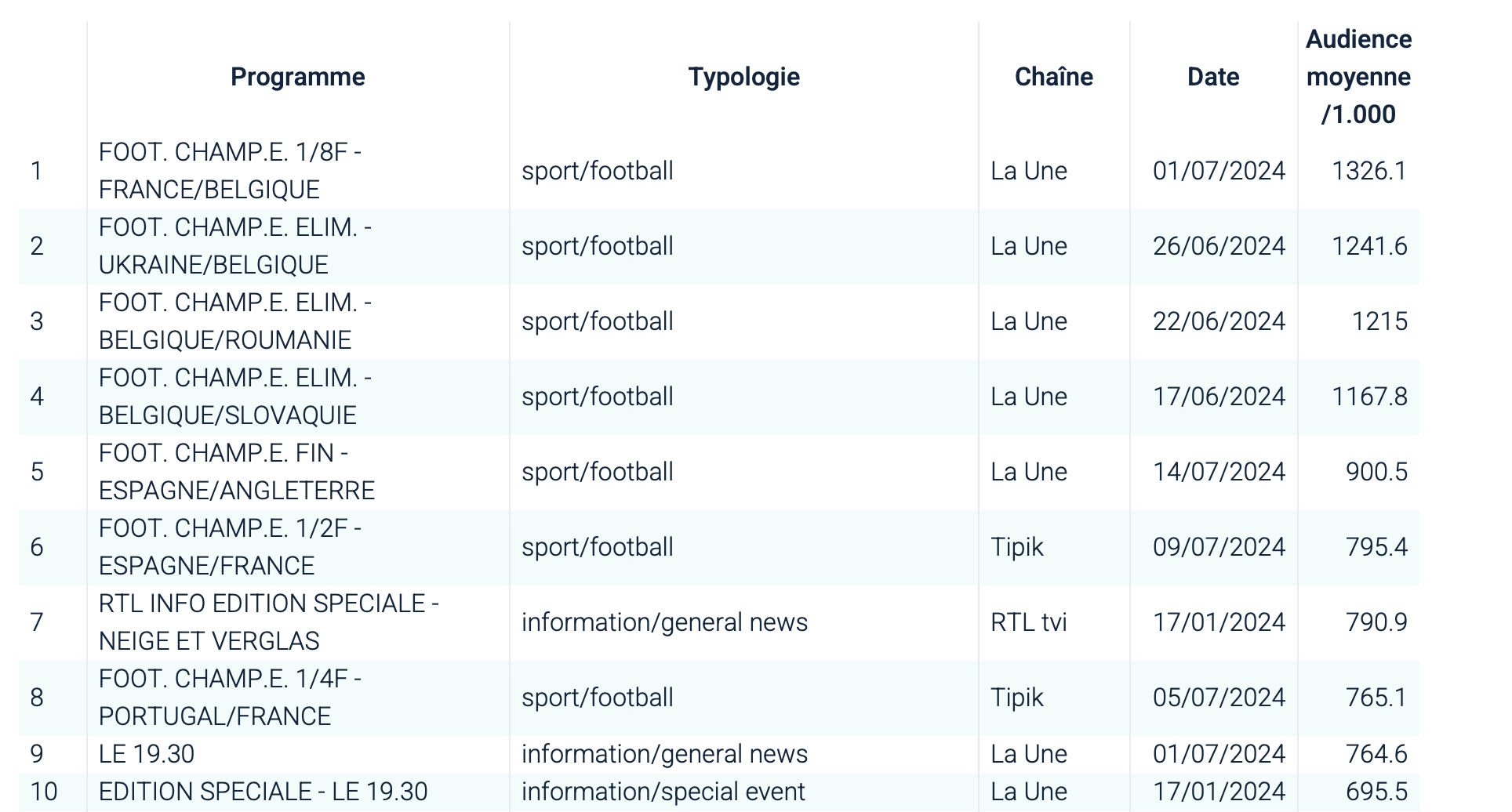 Si l’on se concentre sur le Top 100 annuel (2025) des programmes les plus regardés en Belgique francophone, on constate une nette tendance : le sport et l'actualité locale ! Les 3 premières places du classement sont en effet occupées par des matchs de foots et diffusés sur La Une.