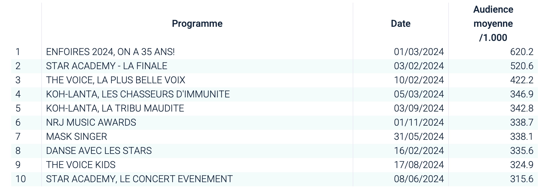 • TF1 : les programmes les plus regardés sont plus diversifiés, avec plusieurs grosses émissions : Les Enfoirés, Star Academy, The Voice, Les 12 coups de Midi, Danse avec les stars, Koh Lanta, les NRJ Music Awards, Mask Singer, Merci Dorothée, etc.