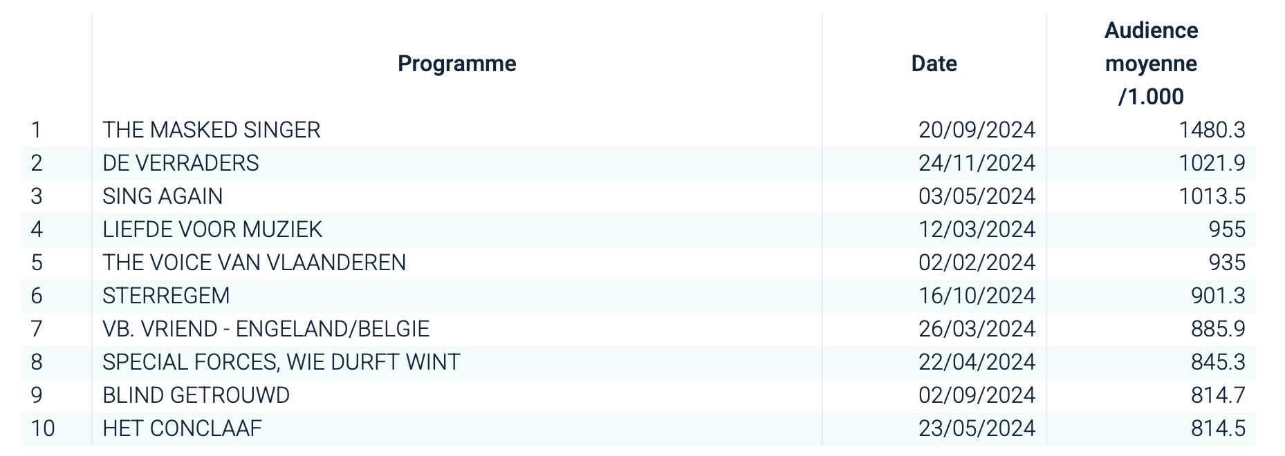 • VTM : le programme “The Masked Singer” est largement en tête, suivi des émissions “De Verraders”, “Dancing wit the stars", "Blind getrouwd". Le reste du classement est dominé par du foot.