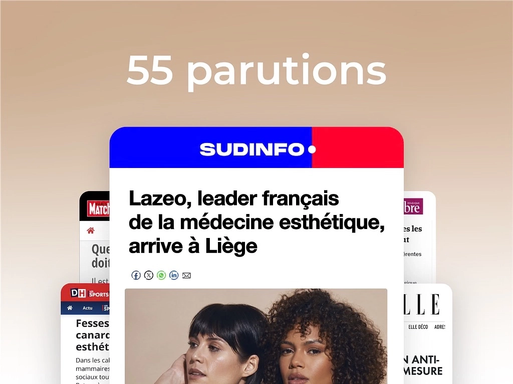La collaboration s’est prolongée par la suite et nous avons accompagné Lazeo dans diverses communications avec les médias à l'occasion de campagnes bilingues, afin de faire parler de leurs nouveaux soins et traitements dotés des dernières technologies. À ce jour, on compte plus de 50 parutions médiatiques, entre Flair, Sudinfo, 7sur7, la RTBF, Paris Match, L'Avenir, Max, Ciné Télé Revue, La Libre, Marie Claire, L'Éventail, Elle, Gael, Metro, etc. !