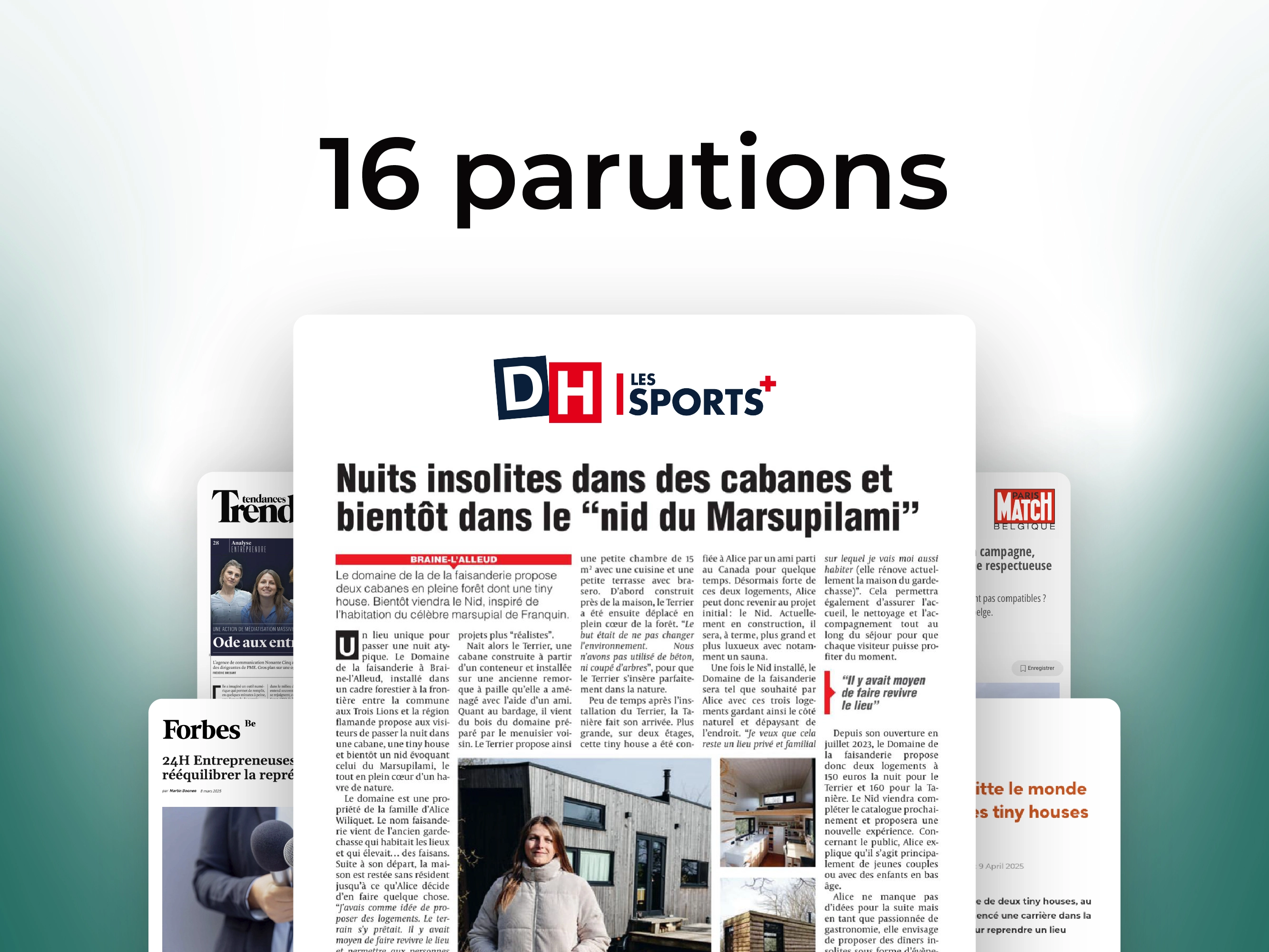 À seulement 28 ans, Alice Wiliquet est à la tête du Domaine de la Faisanderie. En 2021, elle a décidé de créer un lieu d’évasion unique sur un terrain plein de charme près de Braine-l'Alleud. En deux ans seulement, ses logements insolites et écoresponsables ont un taux de remplissage de 100% tous les week-ends, en raison de la tranquillité du cadre, le confort des cabanes et sa localisation inédite, à 30 minutes de Bruxelles et deux pas du bois de Halle.
