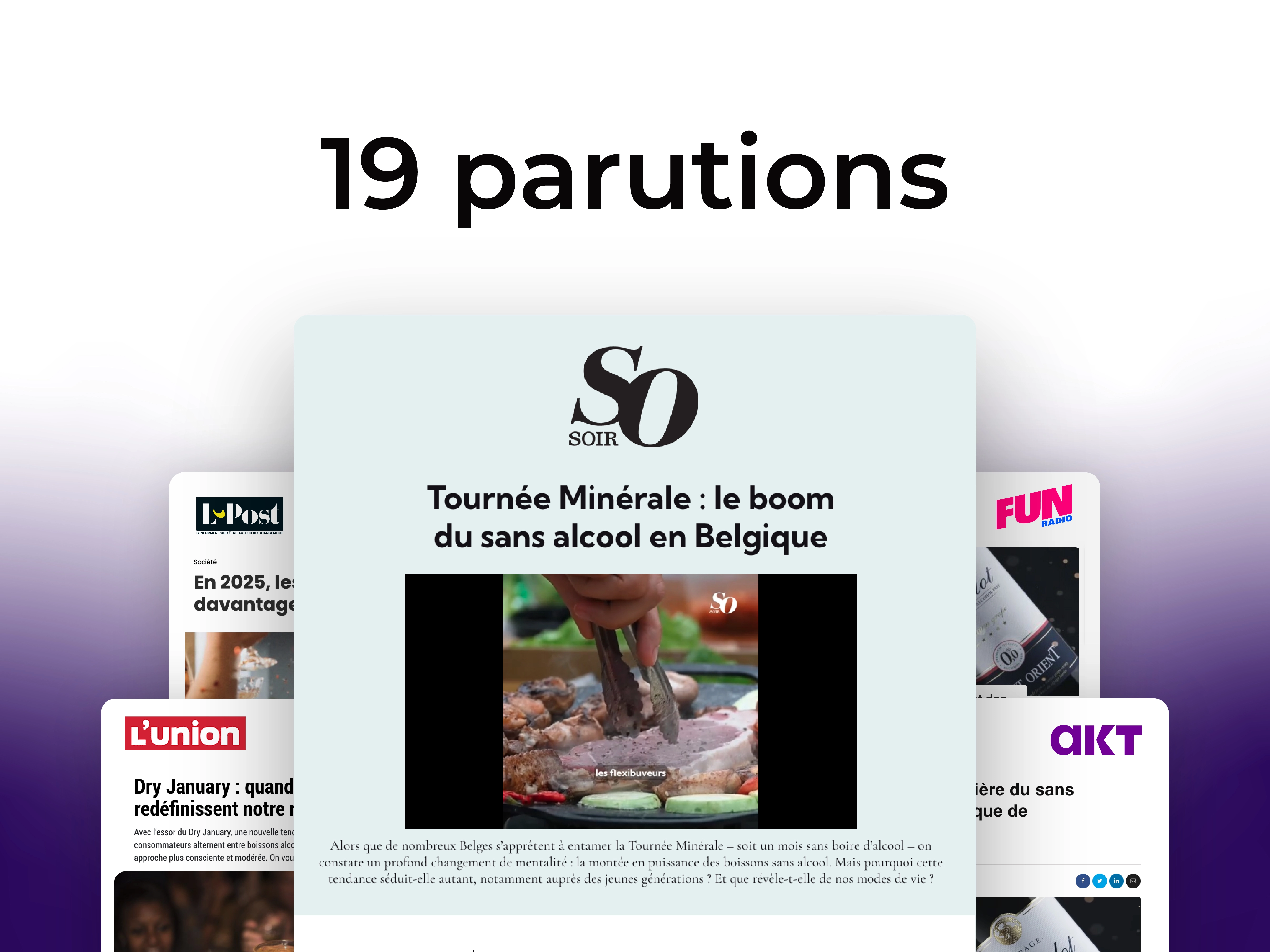Nous avons organisé une campagne de notoriété pour la marque en Belgique, à l'occasion du Dry January et de la Tournée Minérale. Dans le même temps, l'entreprise a été sacrée "Marque de l'année 2025" par les consommateurs, l'occasion parfaite de communiquer ! La Libre Éco, LNRadio, Radio Contact, Fun Radio, Ciné Télé Revue, So Soir, Soir mag, Flair, Max, LN24, LPost, etc. : nombreux sont les médias qui ont fait briller la marque belge.
